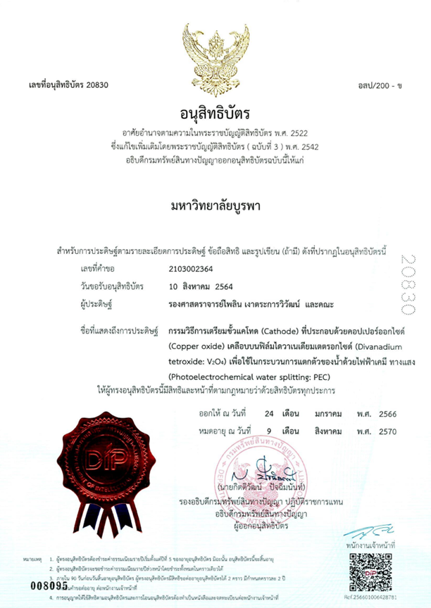 รองศาสตร์จารย์ไพลิน เงาตระการวิวัฒน์ และคณะ ได้รับการจดอนุสิทธิบัตร เรื่อง “กรรมวิธีการเตรียมขั้วแคโทด (Cathode) ที่ประกอบด้วยคอปเปอร์ออกไซด์ (Copper oxide) เคลือบบนฟิล์มไดวาเดียมเตตรอกไซด์ (Divanadium tetroxide: V2O4) เพื่อใช้ในกระบวนการการแตกตัวของน้ำด้วยไฟฟ้าเคมี ทางแสง (Photoelectrochemical water splitting: PEC)” เลขที่อนุสิทธิบัตร 20830 ออกให้ ณ วันที่ 24 มกราคม พ.ศ. 2566